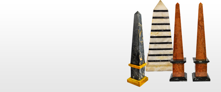 | Vintage Italian obelisks with rouge obelisks (top), and cream and grey plinths. Unusual Italian design. 14.5 inches tall. Our Price: $1,150.00 |